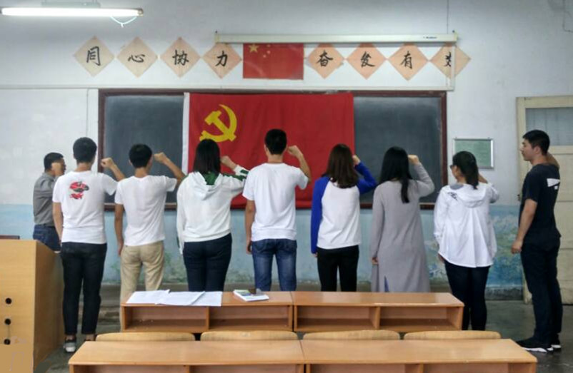 仪式开始,全体肃立,陈柯旭等新发展的8位新党员上台,在邹棠华同志领誓下,面对党旗庄严宣誓。