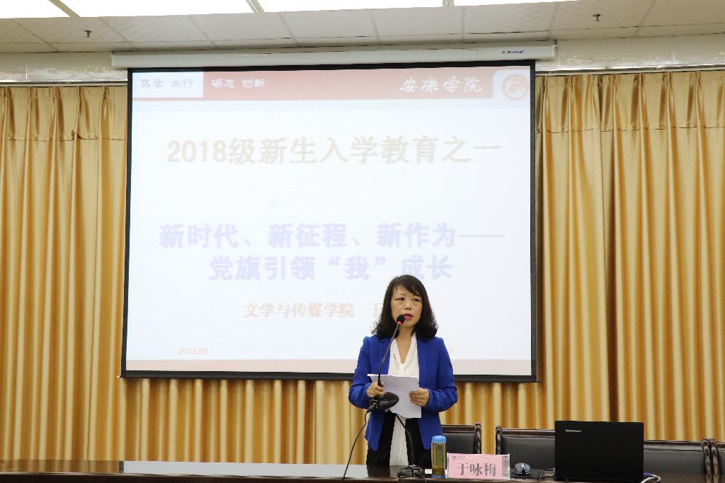 接下来,于咏梅为新生做题为“新时代、新征程、新作为――党旗引领‘我’成长”的主题讲座。讲座开始前,她首先肯定了2018级新生在军训中的优异表现,为他们表现出的信心、决心和勇气感到由衷的高兴和自豪,适逢2018级汉语言文学专业单招班的杨丽同学在9月20日过生日,她带领现场300全名老师与员工共唱生日快乐歌,为杨丽同学送上了亲切的生日祝福,使杨丽同学度过了大学里第一个非常有纪念意义的生日。