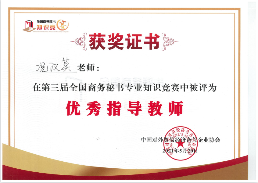 在秘书学专业师生的共同努力下,3044永利官网最终获“优秀组织奖”,况汉英老师获“优秀指导教师”,杨垚奀、陈兴艳、唐磊、郭杨、刘薇等22名同学获竞赛二等奖,张时雨、惠夏云、许凯华、陈佳悦、李佳仪等22名同学通过资格认定获“高级商务秘书证书”。本次知识竞赛对进一步提振秘书学专业员工职业综合素养、学习自信心,促进公司秘书学专业发展起到了重要作用。