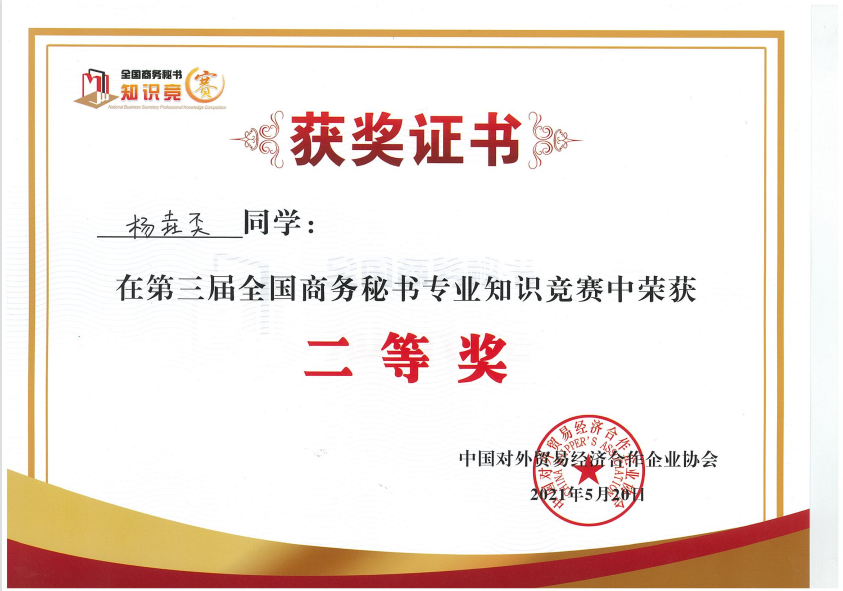 2021年5月15日,3044永利集团秘书学专业2018级、2019级、2020级七十五位员工参加了第三届全国商务秘书专业知识竞赛,二十二名员工获得竞赛二等奖,二十二名员工获“高级商务秘书”证书。
