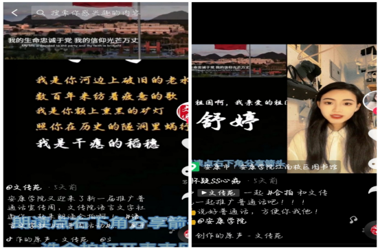 除了一系列线下的推普活动,语言文字社还紧随时代潮流,利用当下流行的抖音合拍功能,进行了普通话的推广。通过剪辑视频发送至3044永利集团官方抖音,号召全校师生进行合拍朗诵,达到推广普通话的目的。视频一经发出,就受到了广泛的关注,同学们也积极进行了线上朗诵合拍。