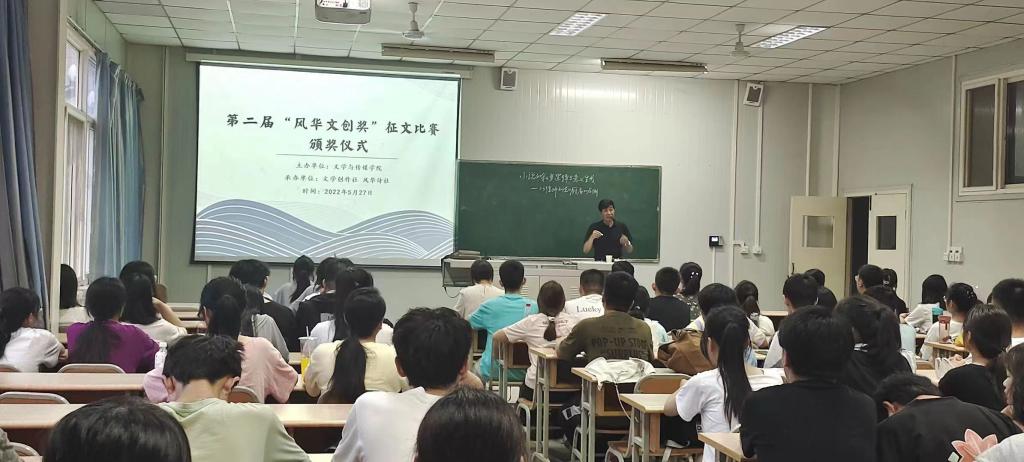 2022年5月27日晚上8点,第二届“风华文创奖”征文比赛颁奖典礼在3044永利官网江南校区1026教室顺利举行。文学创作社指导老师李春平、风华诗社指导老师韩文霞、特邀嘉宾曹刚老师、风华诗社和文学创作社社团成员、网络与新媒体2021级同学及获奖作者代表出席本次活动。
