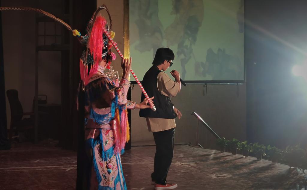 在秦声的悠悠乐曲中,演出大幕缓缓开启。上半场,热耳酸心的秦腔《黑叮本·二进宫》、《五典坡·探窑》、《五典坡·赶坡》轮番上演,一个个精美的造型令在场的师生眼前一亮,一步一景一画卷,一曲一舞一光影。由王铮、刘芳、焦钰、李月婷带来的舞蹈《旧梦惊尘》、《探窗》灵动的将上半场串联起来,恍如穿越。