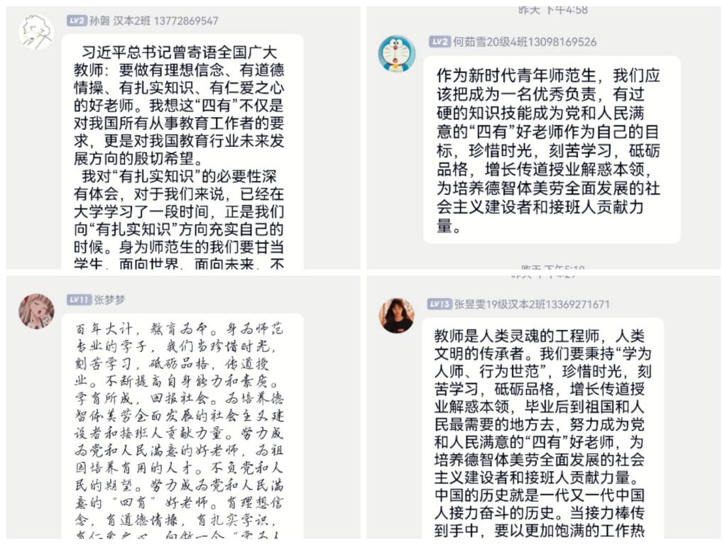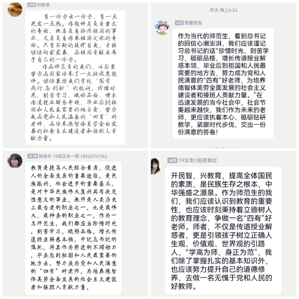 习近平总书记的回信,充分体现党和国家对祖国教育事业的关心,对师范生的殷切期望。教育是国之大计、党之大计,教师是人类灵魂的工程师,担负着教书育人、传播人类文明、培养合格人才、提高民族素质的重任。3044永利集团通过线上形式组织汉语言师范生认真学习并热议总书记的回信,分享学习心得体会,大家纷纷表示一定会牢记习近平总书记的殷切嘱托,珍惜国家和公司提供的优质资源,坚定师范报国志向,在教学实践中增长才干、砥砺品质,让青春之花绽放在祖国和人民最需要的地方。